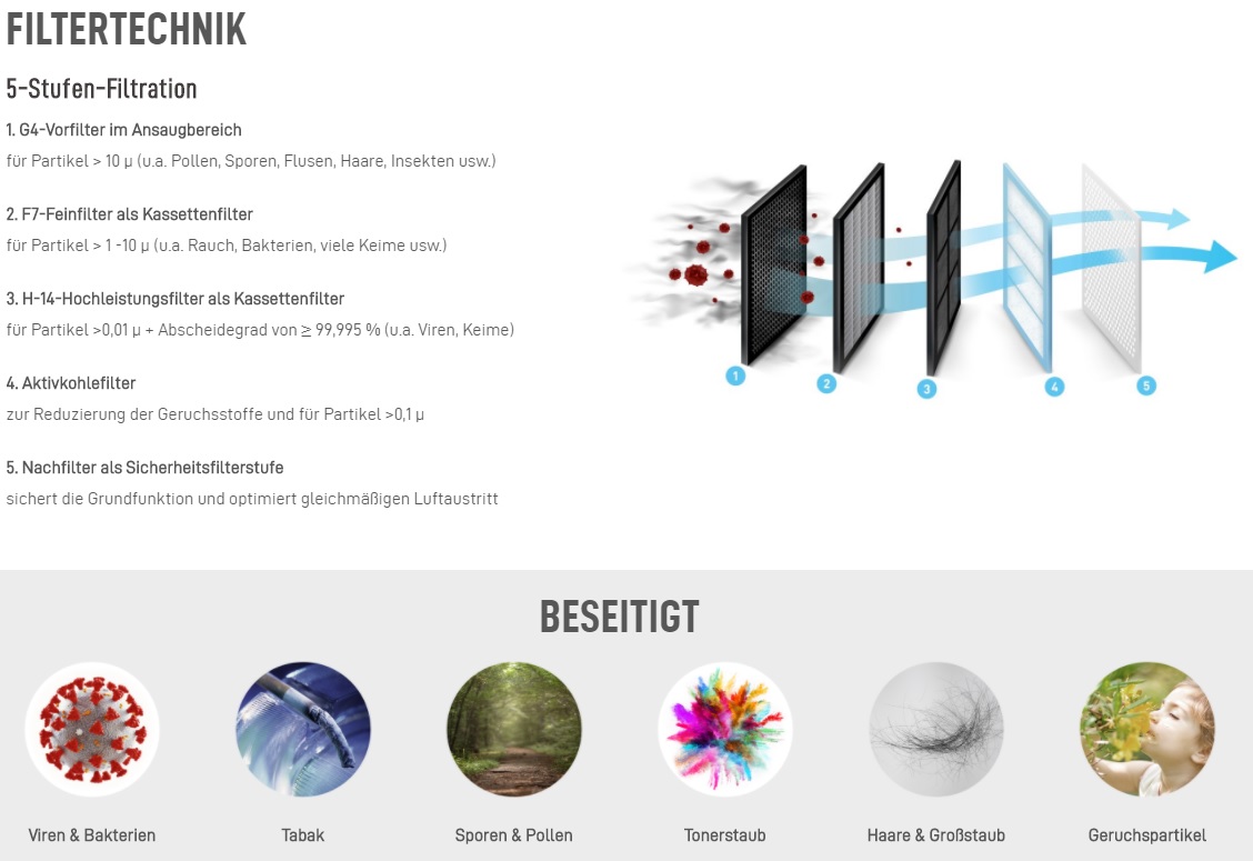 Durch die 5-Stufen-Filtration mit Grob-und Vorfilter, einem Hochleistungs HEPA H14 Filter, dem Aktivkohlemodul und einem Nachfilter wird die Luft nicht nur von über 99,995% aller Viren, Bakterien, Pollen usw. gereinigt, sondern zusätzlich werden Geruchsstoffe reduziert.